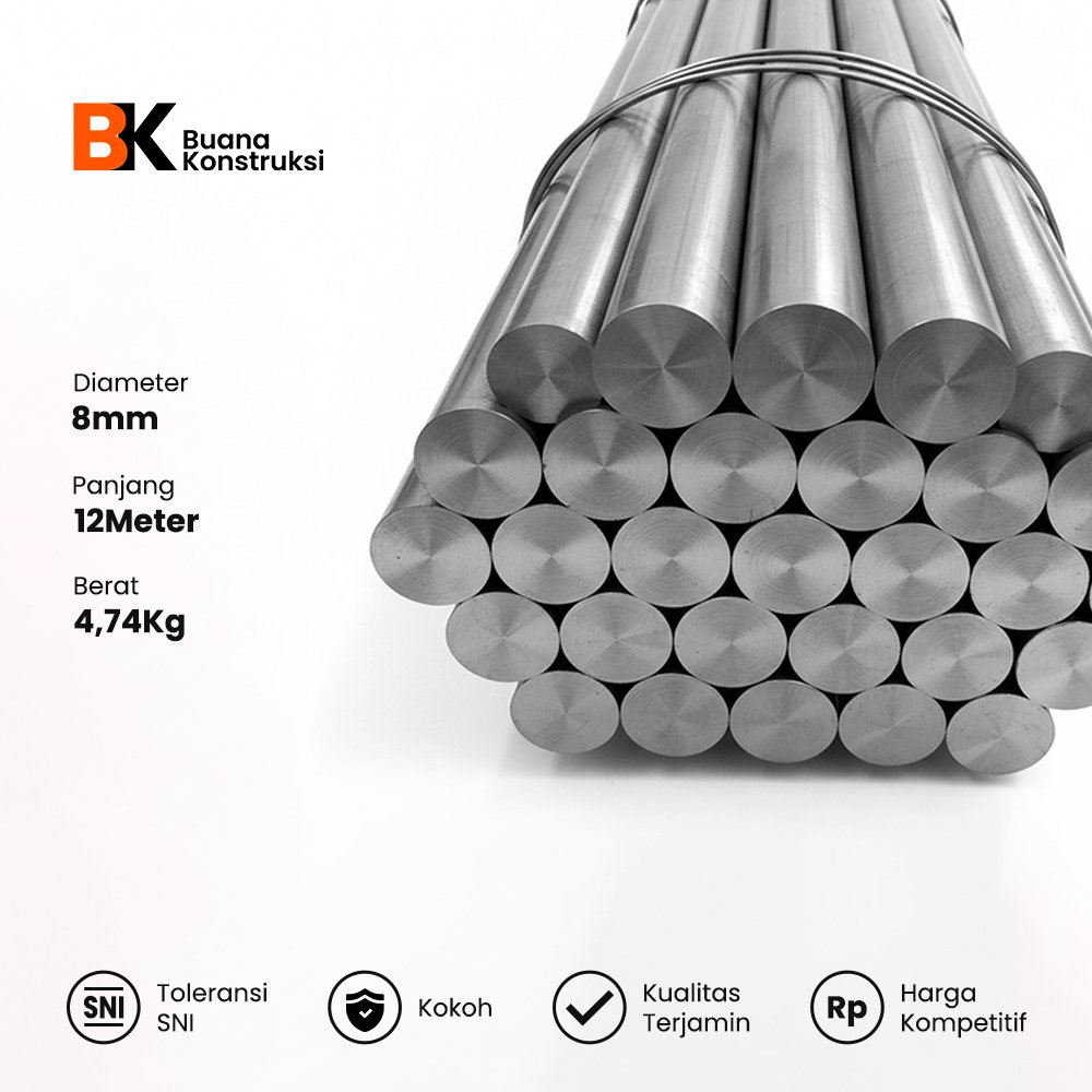 Besi beton polos 8mm adalah baja tulangan bulat dengan diameter 8 milimeter, standar untuk konstruksi, dijual per batang (biasanya 12 meter), bersertifikat SNI, dan sering dipakai untuk pengikat, penguat cor, atau pagar, dengan berat sekitar 0,395 kg/meter