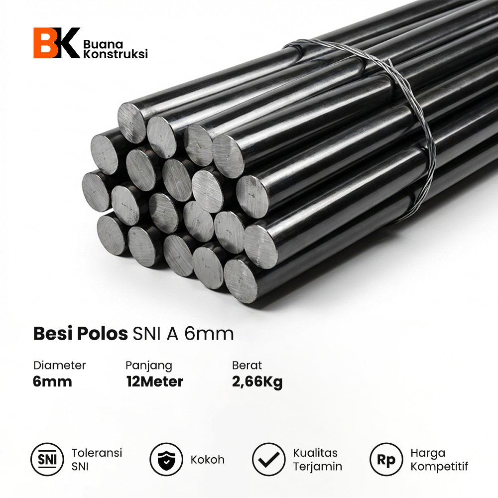Besi Beton Polos 6mm biasa disebut besi tulang beton adalah salah satu material pembentuk beton struktur. Besi beton diproduksi secara umum terdiri dari 2 jenis yaitu besi beton permukaan polos (round bar) dan besi beton ulir (deformed bar). Perbedaan Pada dua jenis besi tersebut adalah bagian permukaannya. Besi polos adalah besi yang memiliki penampang bundar dengan permukaan licin atau tidak bersirip. Sedangkan besi ulir memiliki bentuk permukaan khusus berbentuk sirip melintang (sirip ikan) yang produksinya dilakukan dengan cara di pilin. Bahan baku besi beton adalah billet dan skrap. Billet adalah baja batangan yang dibuat dari hasil pengecoran bijih besi (pig iron) sedangkan skrap adalah besi tua atau besi bekas yang dilebur dengan temperature tertentu.